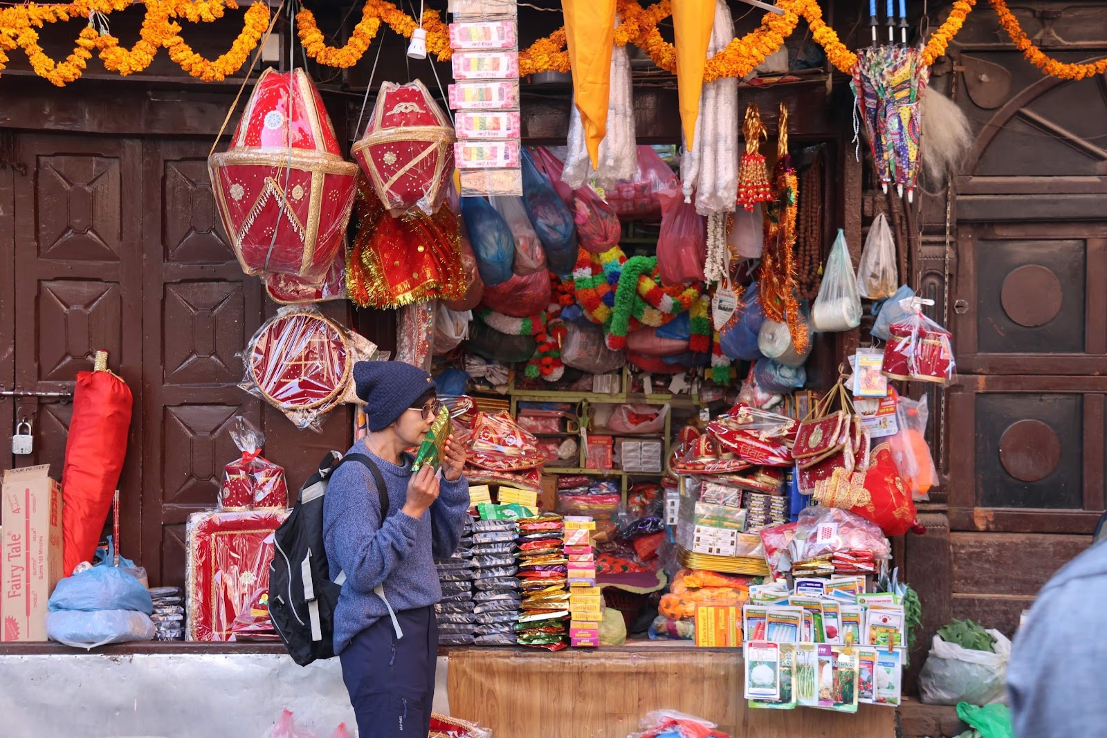 Six streets converge in Asan, giving the square a perpetual bustle.The bazaar in Asan attracts shoppers from all over Kathmandu because of the tremendous variety of merchandise sold here, ranging from foodstuffs, spices and textiles to electronics and bullion.
