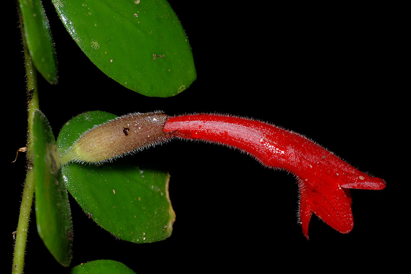This species of Gesneriaceae shrub, 30-80 cm tall, branching and spreading low. The branches are light brown, long and rather brittle, each branch can be up to 60 cm long. Simple leaves, arranged oppositely, alternately, perpendicularly, ovate or lanceolate to oblong parallel, 2-3.7 cm wide, 3.2-8 cm long, pointed tip, tapered or rounded base, smooth edges or sparsely wavy, the top has scattered white spider web-like hairs, the bottom has white spider web-like hairs, 10-12 leaf veins on each side, clearly visible on both sides, leaf stalks can be up to 1 cm long, old leaves at the base of the stem curl and fall off.